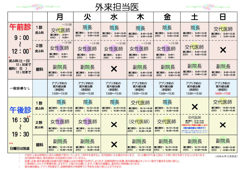 - 午後:皮ふ科 1診 院長・2診 交代医師/眼科 副院長